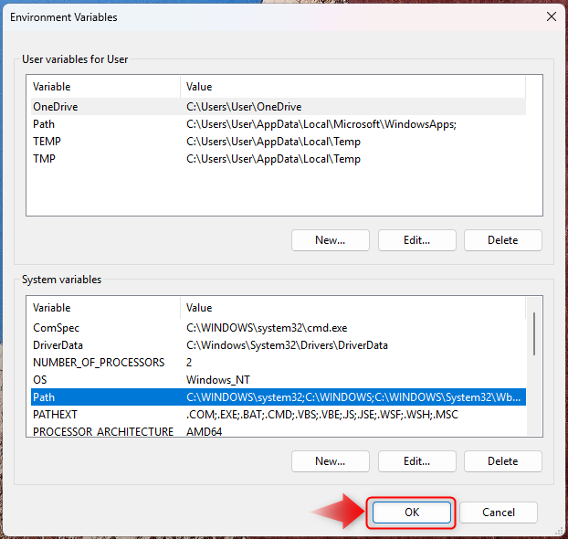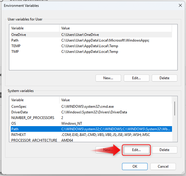 - Under “System variables,” select the “Path” variable and click “Edit.”